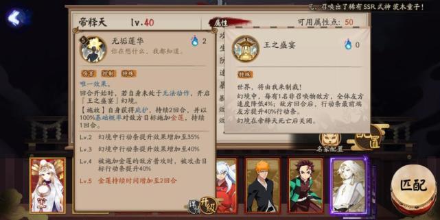 阴阳师SSR帝释天二技能:无垢莲华,回合开始时,若自身未处于无法动作,开启「王之盛宴」幻境。
