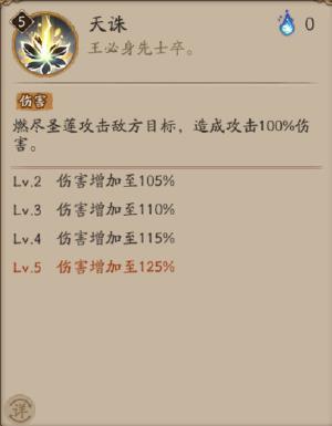 阴阳师SSR帝释天一技能:天诛就是简单单体攻击,能够造成一定量的伤害。燃尽圣莲攻击敌方目标,造成攻击100%伤害。