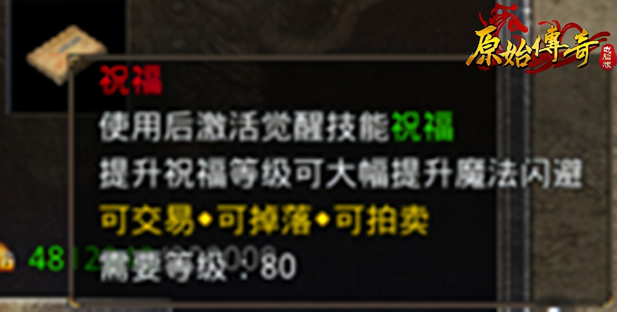 祝福:祝福可提高自身闪避魔法伤害的概率,技能的意思是随着概率越高,使用魔法技能攻击都有几率闪避,怪也会有闪避效果。此技能效果提升的越高的话,道士、法师打你闪避的几率就越高,是PK打架专门针对道士、法师的一个技能效果,祝福技能书合成是需要祝福宝石*1+雷之结晶*3,而且合成的觉醒技能书是可以进行交易以及拍卖的,但是也会死亡掉落。