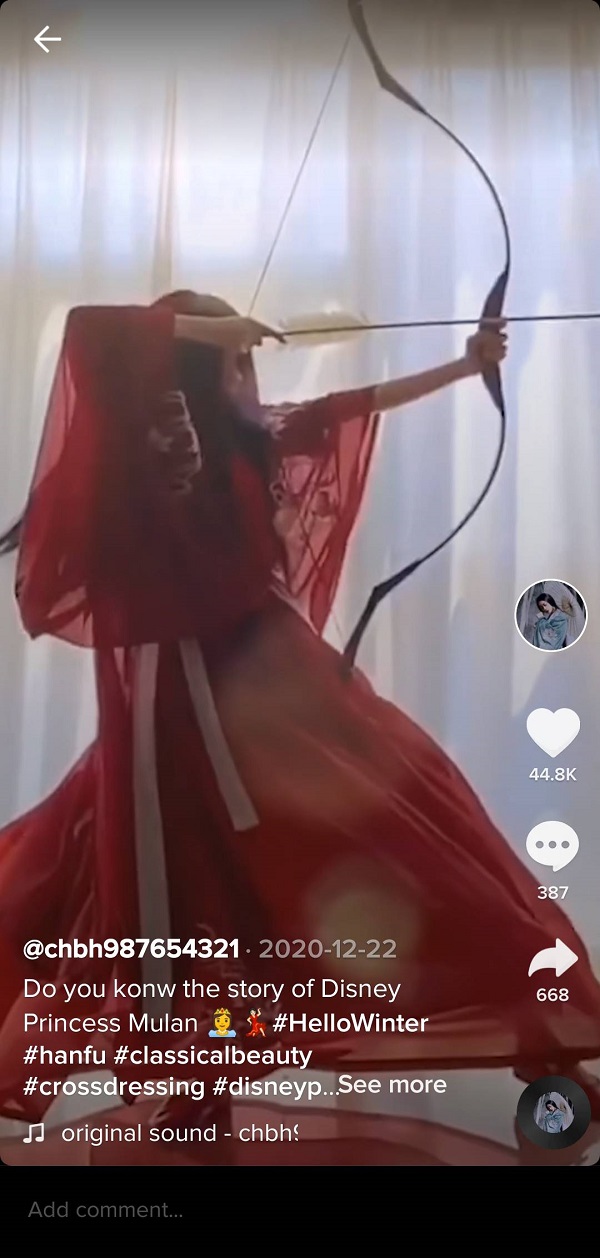 贵州网讯(本网记者 安青松)画面中,一位女子瞬间完成换装和弯弓搭箭的动作,最后留下一个飘逸的背影。这是TikTok一段“cos”(角色扮演)花木兰的短视频,自2020年12月发布以来已经获得4.5万点赞,超过24万观看。