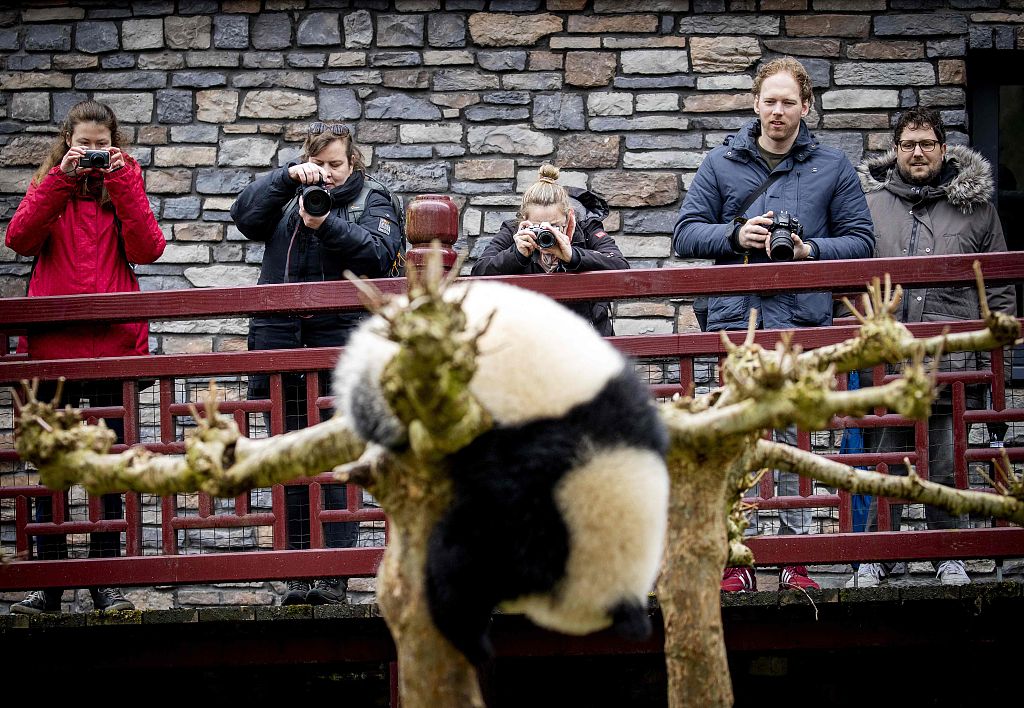 当地时间2021年4月14日,荷兰雷纳,当地游客前来观赏大熊猫“繁星”。“繁星”于2020年5月1日在荷兰雷纳欧维汉动物园出生,它的父母是旅居荷兰的大熊猫“武雯”、“星雅”。
