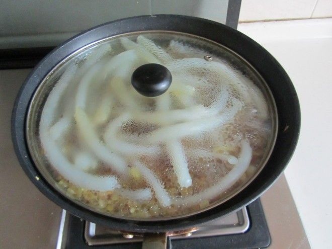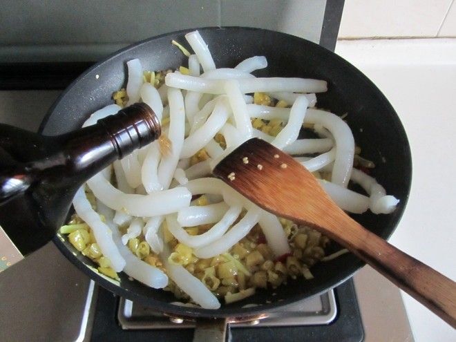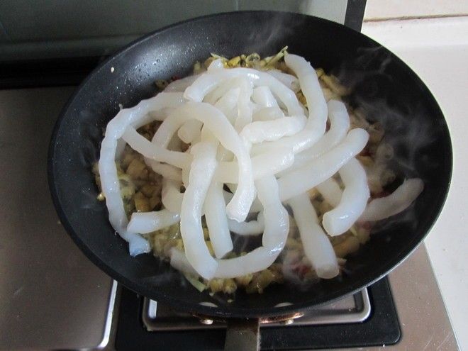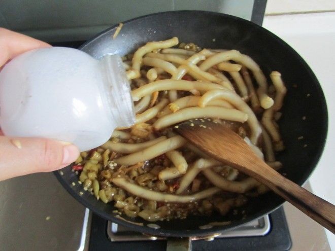 2、下入鲟鱼筋翻炒后,加入少量的料酒和生抽加盖焖煮两分钟