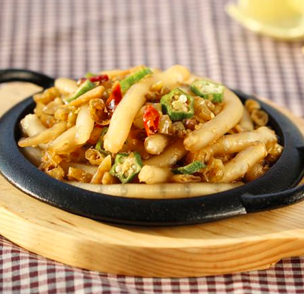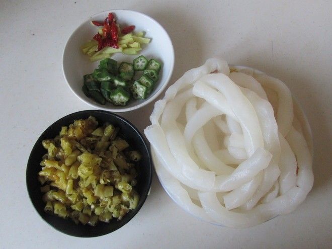 主料:鲟鱼筋1包 泡椒8-10颗 红辣椒2个 黄秋葵3个