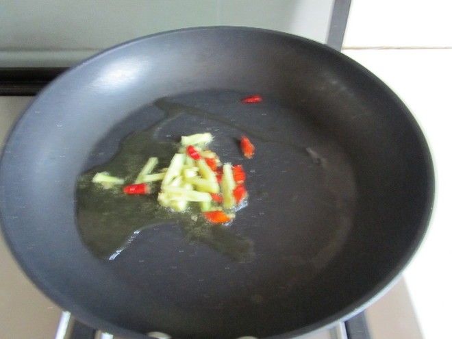2、烧热锅, 放入适量的油, 下入姜丝和红辣椒爆香
