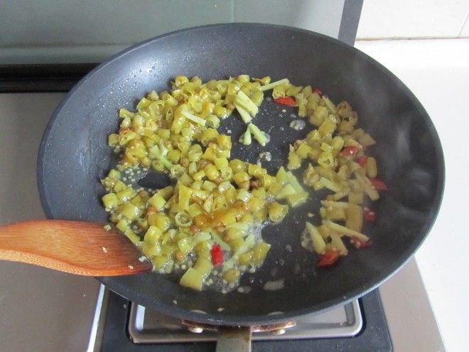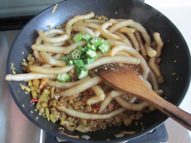 8、起锅前放入黄秋葵翻炒变色后盛出。
