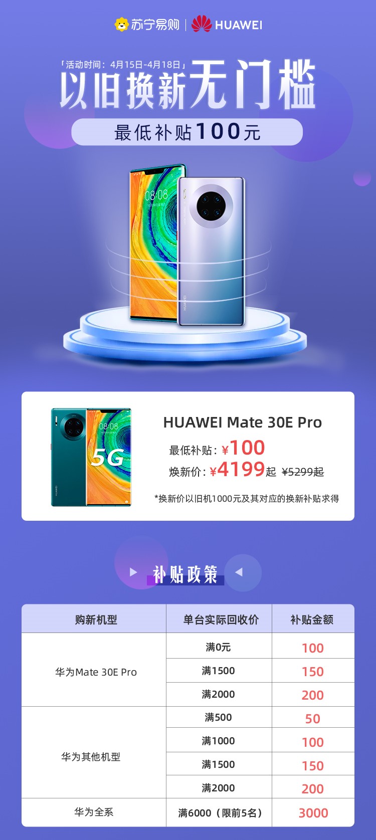 据了解,4月15日至4月18日期间,消费者进入苏宁易购APP自营华为、荣耀、vivo、realme指定型号商品购买页面,点击“马上抢”选择以旧换新,选择新机并评估旧机,只用支付差价(差价=新机价-旧机价-对应补贴)选择上门或到店下单,即可享受旧机直接抵扣新机款、和最低100元无门槛补贴,新机到货后同城帮工程师将联系用户确定时间进行服务。这意味着旧机在回收时只要能够开机、解锁,无论外观成色、内存大小、是何品牌,甚至回收价为0元,都可获得最低100元起的无门槛补贴。