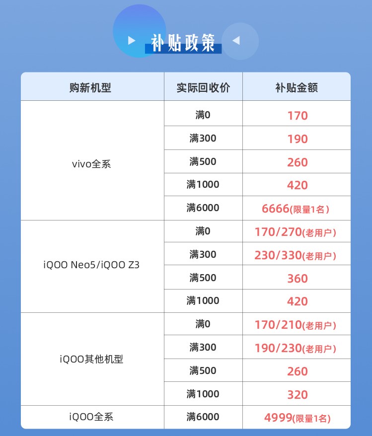 以通过以旧换新的方式购买iQOO Neo5系列手机为例,iQOO老用户旧机回收满0元,可获得270元补贴,普通用户回收满0元,可获得170元补贴;以旧换新购买vivo全系机型,回收价满0元,即可获得170元补贴,至高可获6666元限量补贴。详细规则可以前往苏宁易购进入以旧换新查看,或搜索“手机以旧换新”直达以旧换新主会场了解具体活动玩法。