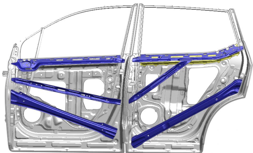 同时,采用的最新车门双倒八字结构设计,可以将侧面碰撞的力均匀有效的分散至车身周边结构件上,避免乘员受到较大伤害的同时,也能改善车门把手处钣金的变形,从而降低车门在碰撞过程中开启的风险。