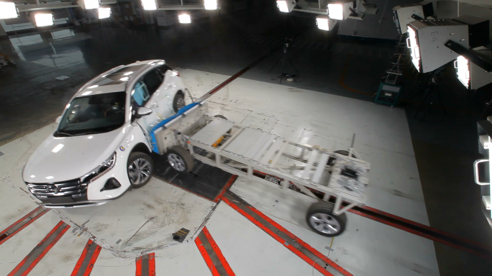 测试方法:在前端处加装了可变形吸能壁障的移动台车会以50 km/h的碰撞速度冲击试验车辆驾驶员侧,而且移动壁障行驶方向会与试验车辆形成垂直角度。