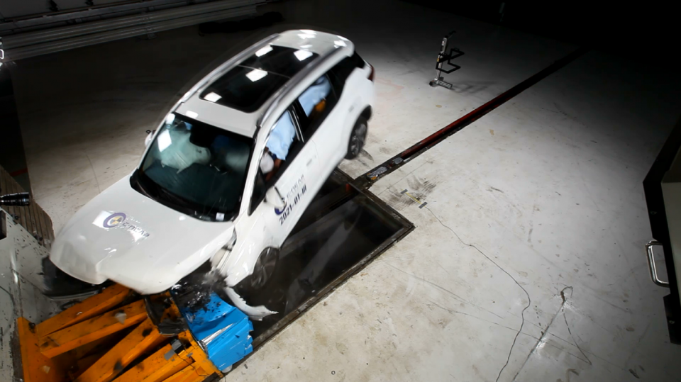 测试方法:将车速提升至50km/h,然后让车头正面100%与刚性墙壁进行碰撞,然后检测前/后排假人的受伤情况。