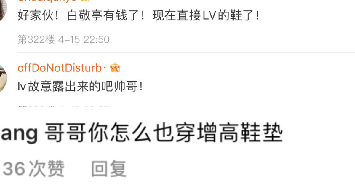 最后是白敬亭脚上的运动鞋,是LV的。但网友们看着很正常的营业照,却被粉丝看穿了白敬亭的小心思,粉丝留言说白敬亭有钱了,这鞋肯定是故意露出来的!还有粉丝直言不讳地问白敬亭:“哥哥怎么也穿增高鞋?”这粉丝真敢,不过我们好爱看哈哈哈哈哈。