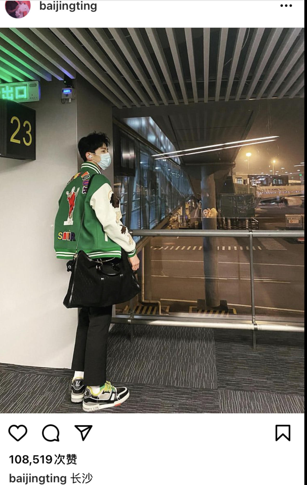 先来说有3个信息点的背影照,白敬亭身穿绿白相间的运动休闲外套,搭配黑色九分裤,站在机场的玻璃窗边,微侧头,少年感十足。