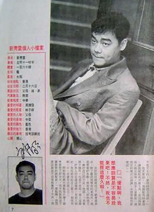 那么刘青云的身高实际是多少呢?粉丝们经过多番论证,基本可以确定刘青云的身高在178-180cm之间。首先在香港某本古早杂志上,有这么一个关于刘青云的高糊档案,档案上显示刘青云的身高是五尺十一寸,换算过来差不多就是一米八这样。粉丝表示,这类古早档案一般是艺人自报的,还是比较可信的。