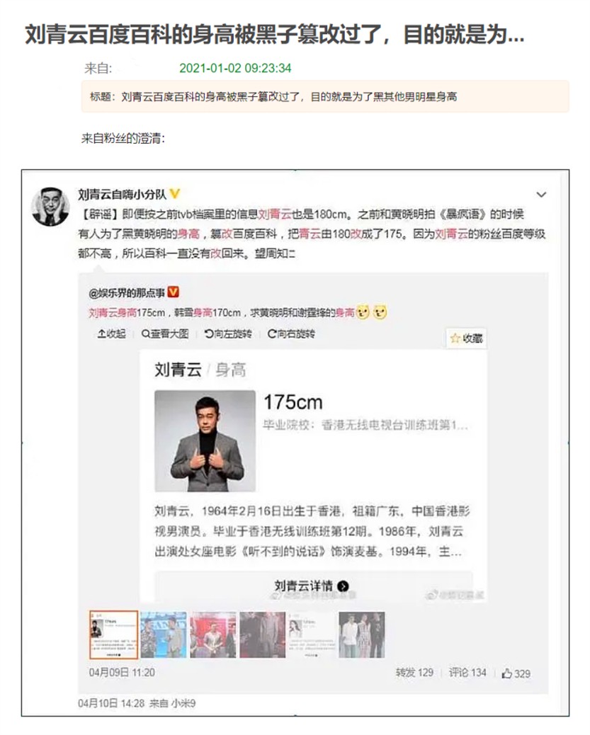 也正因规定如此,某些黑子便钻了空子。黑子们为了黑某个人、某件事,便会对百度百科内容进行恶意修改,只为误导他人,起到黑人、黑事的目的。像是近日,我国香港知名演员刘青云的粉丝就发现,自家偶像的百度百科被黑子恶意篡改过,黑子将刘青云的身高恶意改成175cm,目的是为黑其他男艺人的身高。但实际上,刘青云的真实身高有一米八左右。