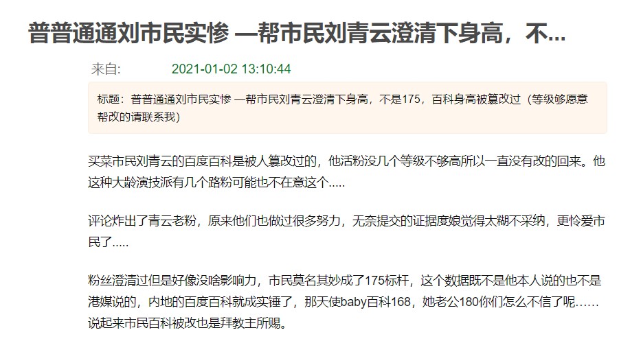 刘青云的粉丝这么说道:“买菜市民”刘青云的百度百科身高是被人篡改过的,由于刘青云的“活粉”没有几个,仅有的“活粉”等级也不够高,所以根本无法将百度百科资料上的身高数据修正过来。刘青云的“老粉”也曾经做过许多努力,无奈提供的证据太模糊,不被百度采纳,因此也无法修改成功。就算是粉丝努力在网络澄清,可惜影响力依然不够,刘青云莫名其妙就成了“175标杆”。