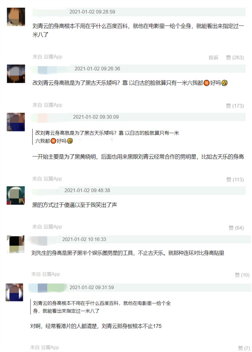 不仅如此,一些网友认为,电影中的刘青云怎么看都不像只有175cm的样子。当他与其他公认的高个子男艺人站在一起时,他也没数据显示的那样。虽说刘青云本人或许不在乎这所谓的身高数据,但如果百度百科的身高数据被证实有误的话,还是要修正过来吧,不然被黑子拿去黑人就不好了。