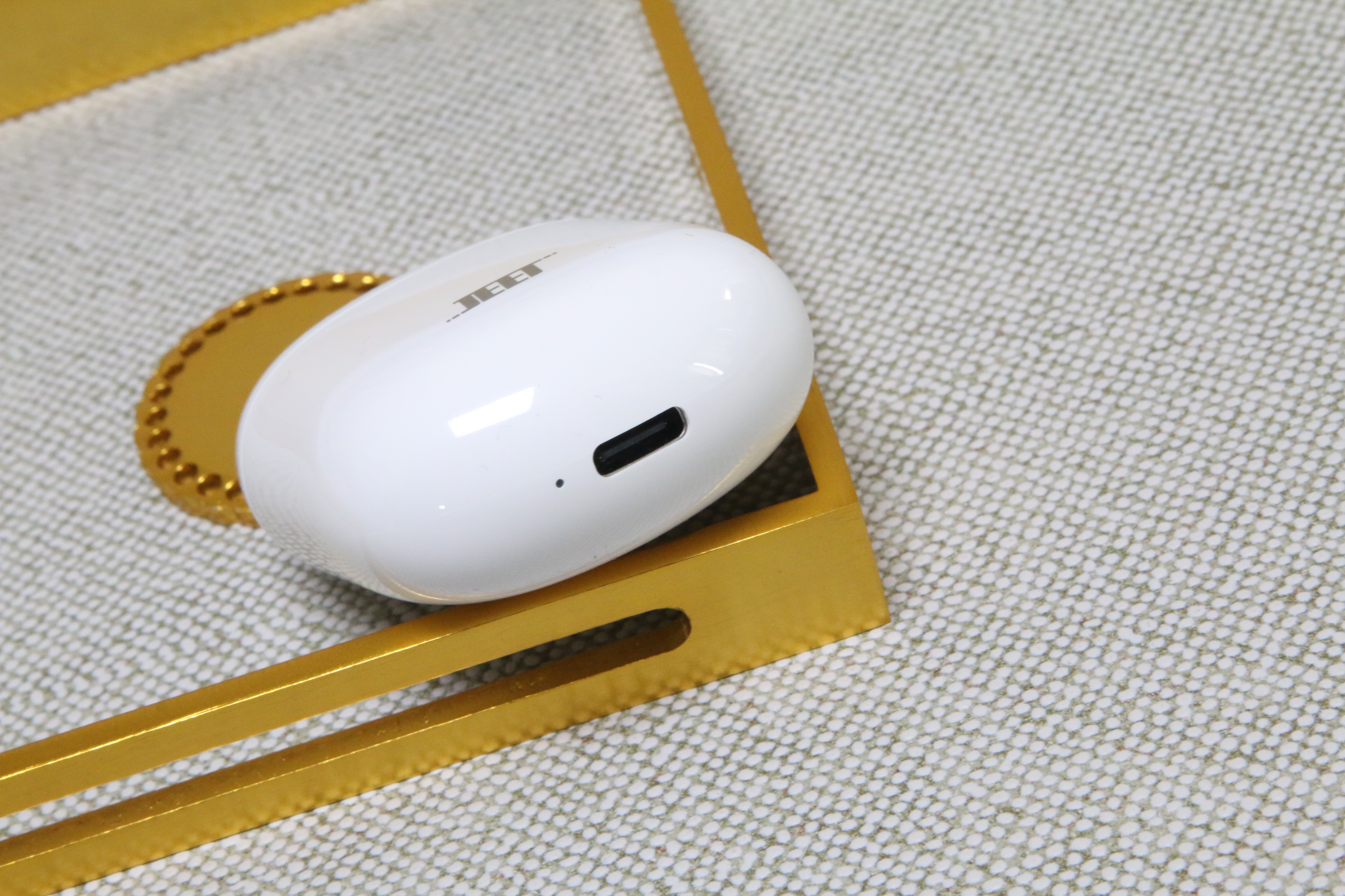 耳机的收纳仓椭圆设计,拿在手里手感很好,正面印有JEET的logo。充电盒很轻,放在兜里 也不凸显,很适合携带出行。