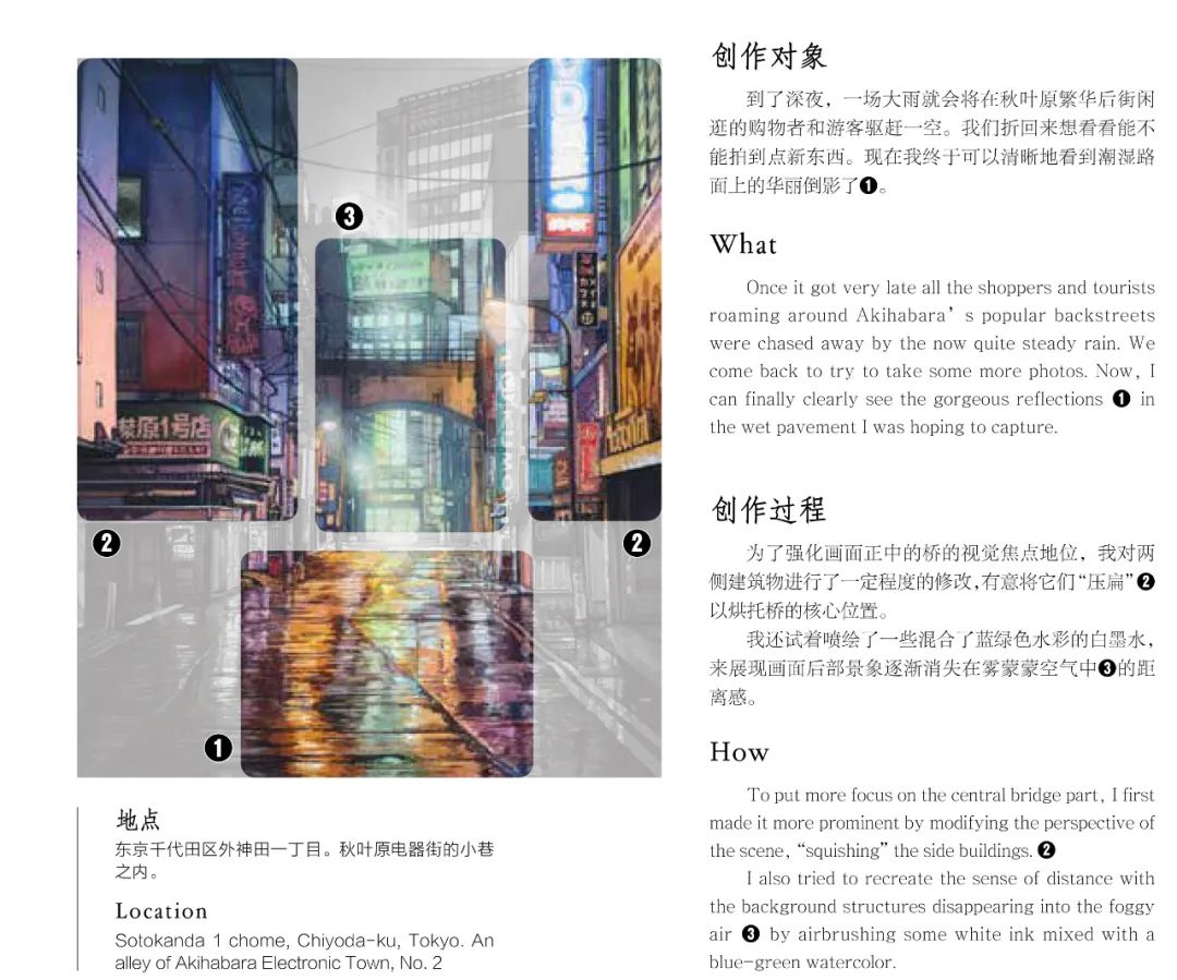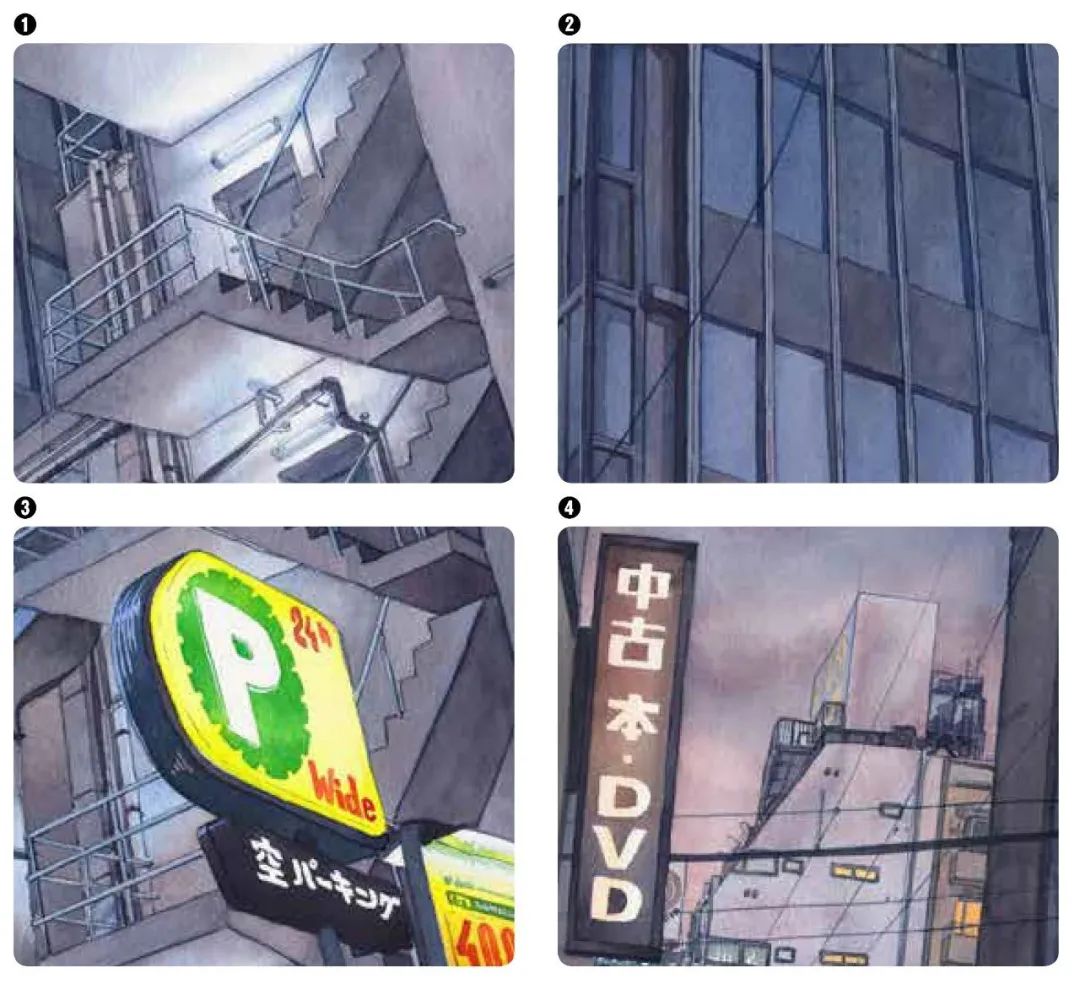 比如,通过非典型或非地标性建筑、常见标识等细节和元素展现东京城市景观;“雨”是作品中的重要要素,能扩大城市场景所含有的信息量……