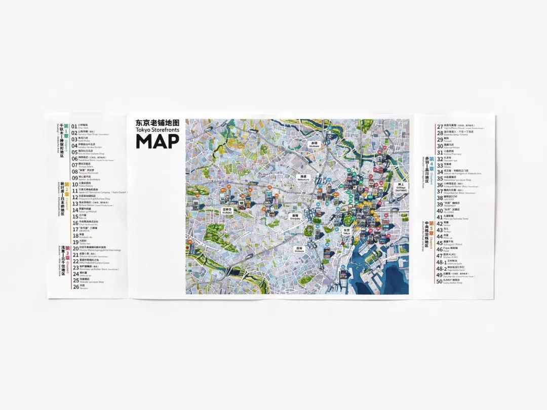 展开书的封套,你会惊喜地发现,封套背面是一张地图。每一家店铺都在地图上有对应的编号,并以颜色区分地区。