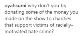 “你为什么不试着把你在节目中赚的一些钱捐给那些支持受害者的慈善机构呢?”