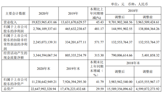 挖贝网4月16日,韦尔股份(603501)近日发布2020年度报告,报告期内公司实现营业收入19,823,965,431.66元,同比增长45.43%;归属于上市公司股东的净利润2,706,109,337.61元,同比增长481.17%。