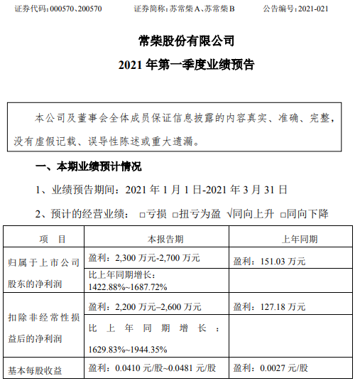 挖贝网4月16日,苏常柴A(000570)近日发布2021年第一季度业绩预告,预计业绩同向上升。报告期内归属于上市公司股东的净利润2,300万元-2,700万元,比上年同期增长1422.88%-1687.72%;基本每股收益0.0410元/股-0.0481元/股。