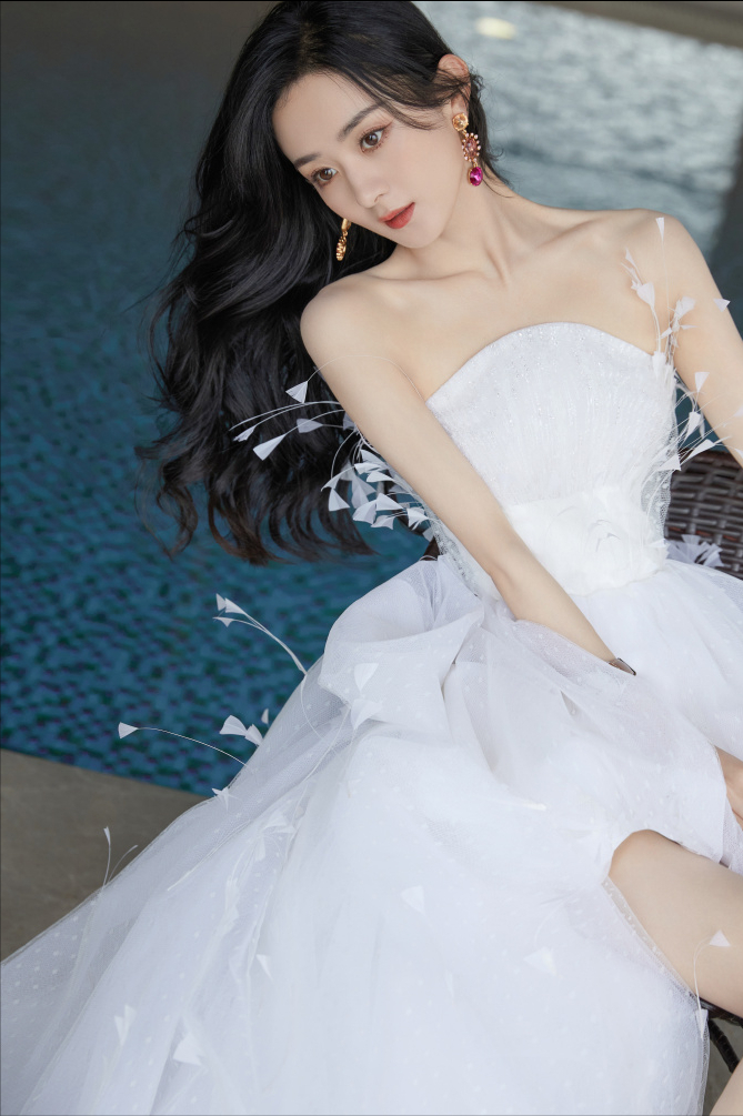 赵丽颖 一袭纯白色抹胸曳地纱裙现身活动。点缀盛开的羽毛优雅动人,宛若白天鹅,露肩抹胸设计凸显完美锁骨线条,散发恣意浪漫的春日气息。