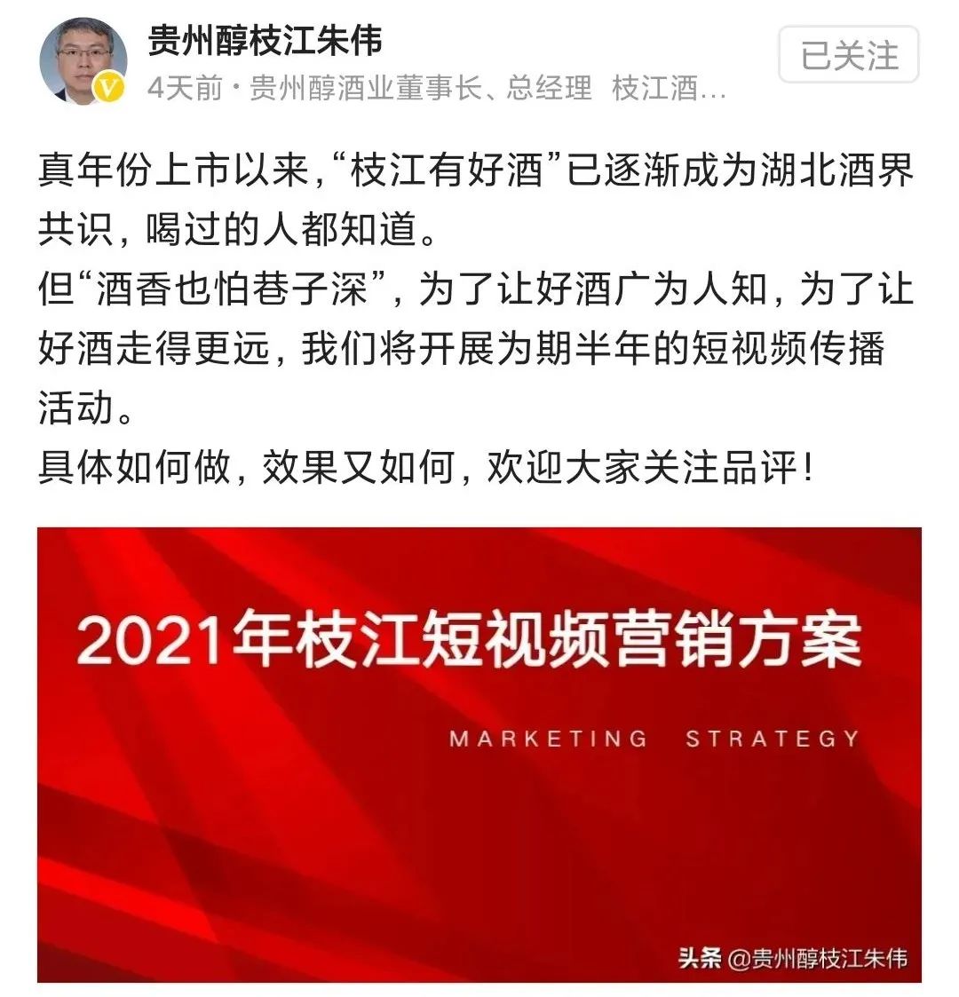 具体来说,相关视频将围绕湖北地缘文化、趣味酿酒故事、 “真年份”产品特色等展开。 除此之外,基于枝江酒业既定的打造“企业家IP”思路,枝江酒业董事长、总经理朱伟也将亲自出镜,全方位融入小视频的录制和拍摄。