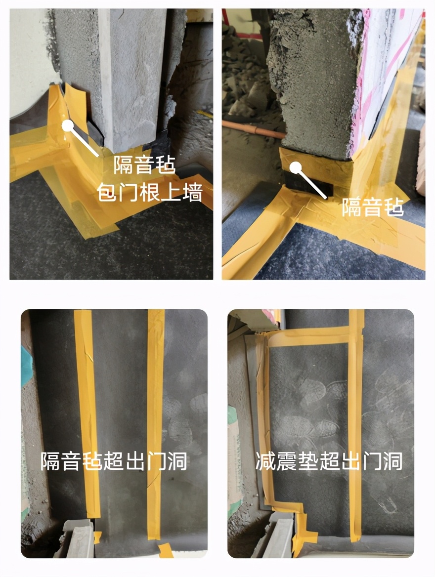 9. 隔音毡超出门洞底部,并且门洞底部返边上墙,高度超过找平层。隔音毡比较薄,不会影响安装房门。