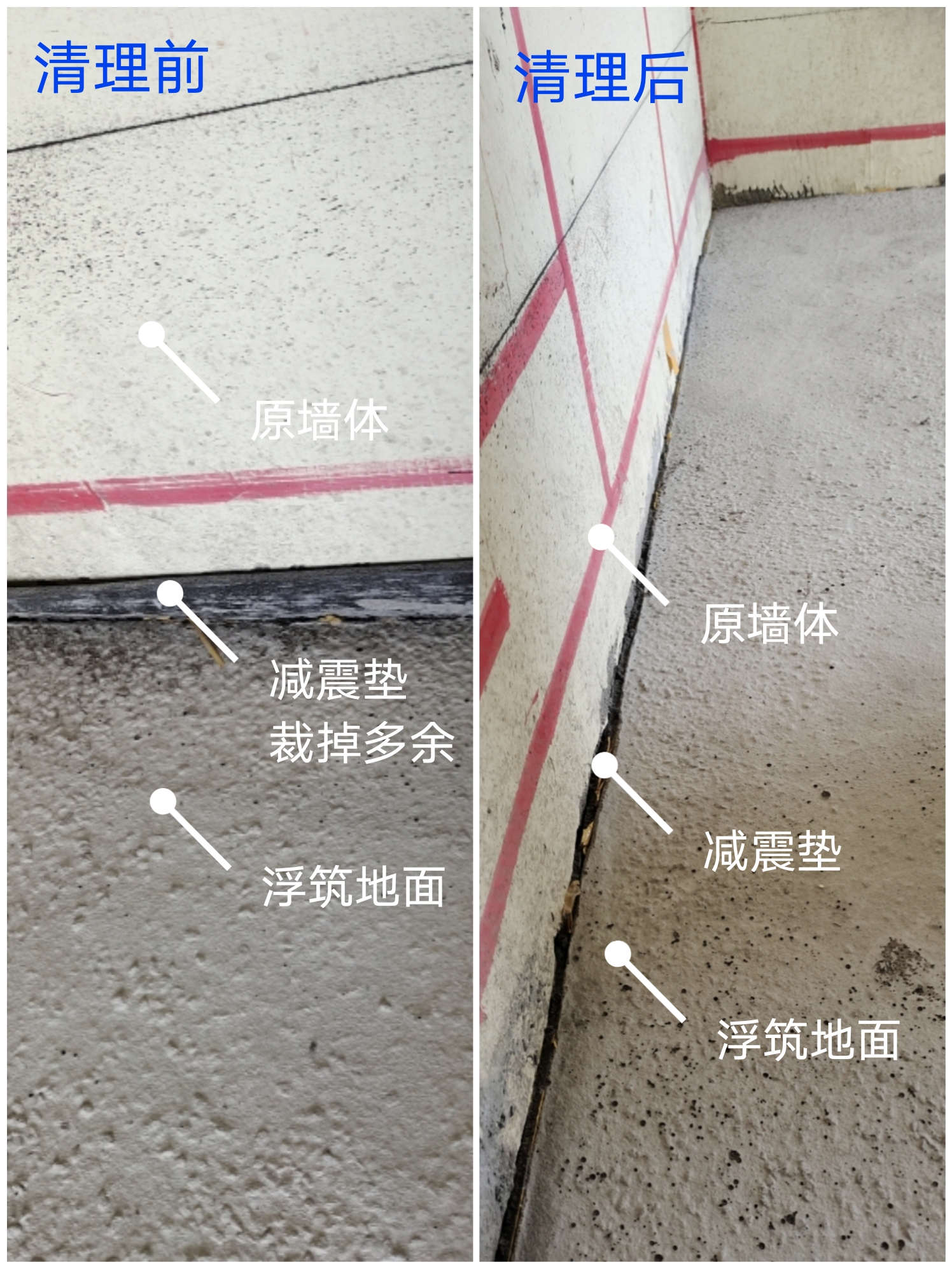 13. 泥工找平。干透后把返边上墙的隔音毡裁剪掉,就能明显看到地面与原墙原地分离开了。