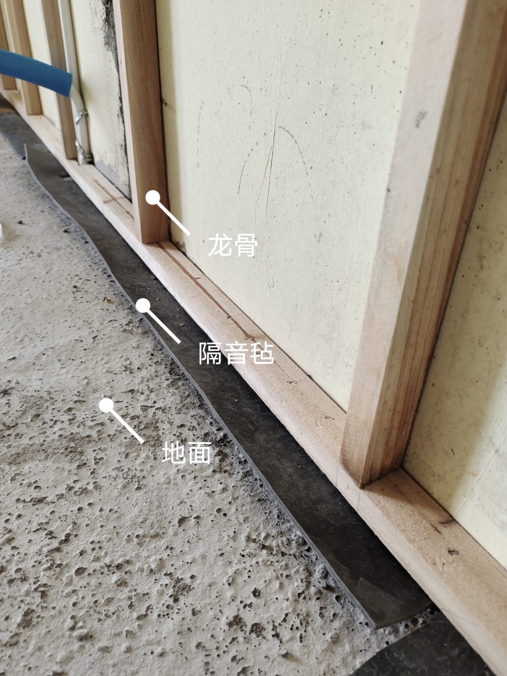 4、骨架和原顶面距离2CM以上,龙骨架和地面之间垫一层隔音毡,保证隔音墙与原地面、原顶面是完全分离开的,避免刚性连接产生声桥。