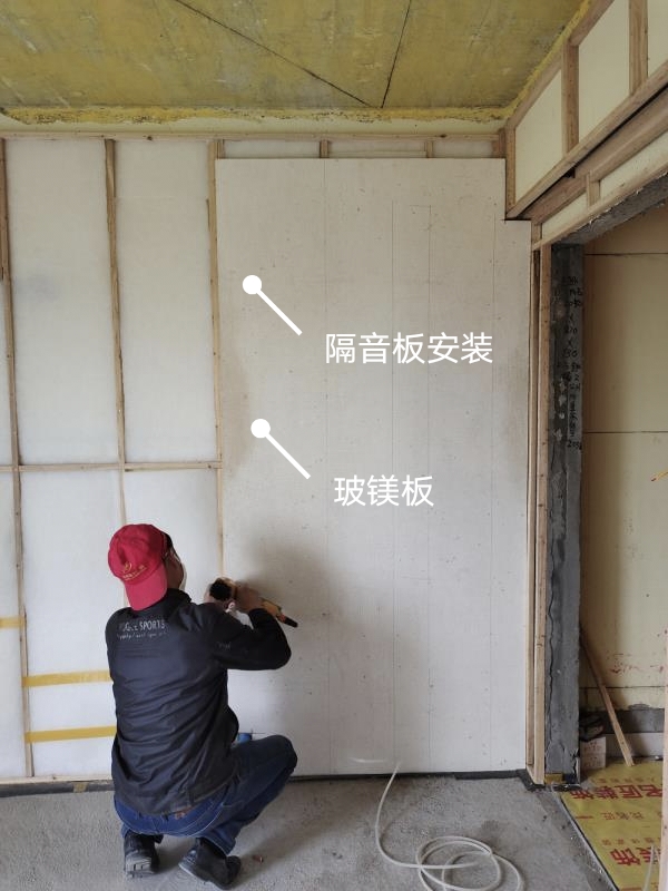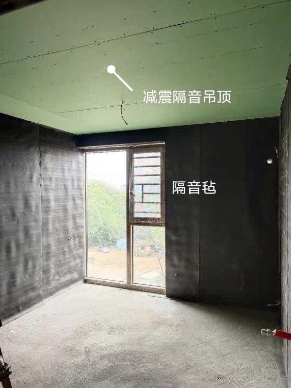 轻钢龙骨+50mm聚酯纤维吸音棉+2mm隔音毡+玻镁隔音板+隔音胶+防水石膏板。