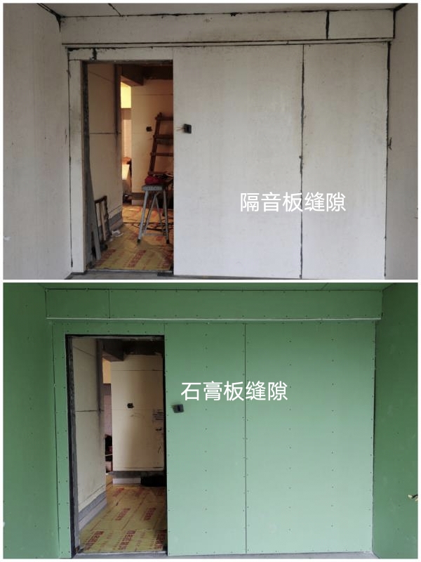 14、石膏板安装方向和隔音板的不同,错开彼此的缝隙避免缝对缝“漏声”。