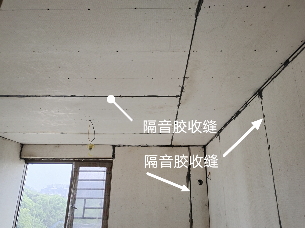 11、隔音板上顶固定好,拼接缝隙填充隔音胶,包括顶面和墙面搭接的缝隙。