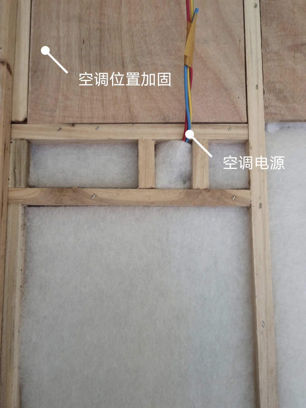 6、空调位置大芯板打底加固。后期选择明装超薄型空调插座,所以不要底盒,能避免产生声学孔洞。