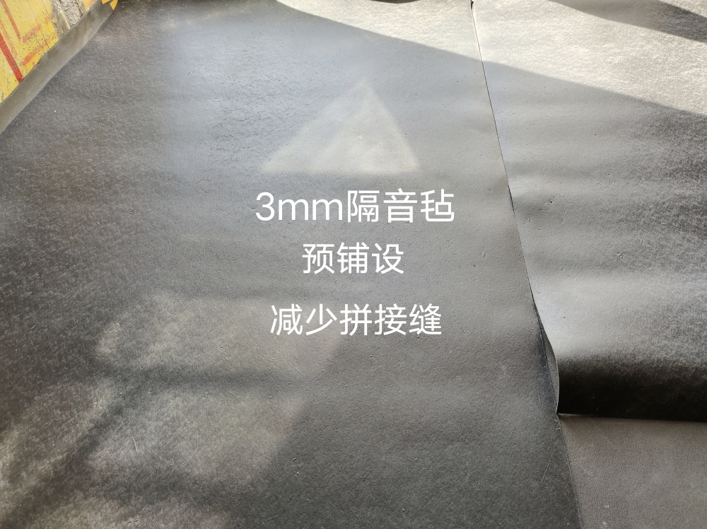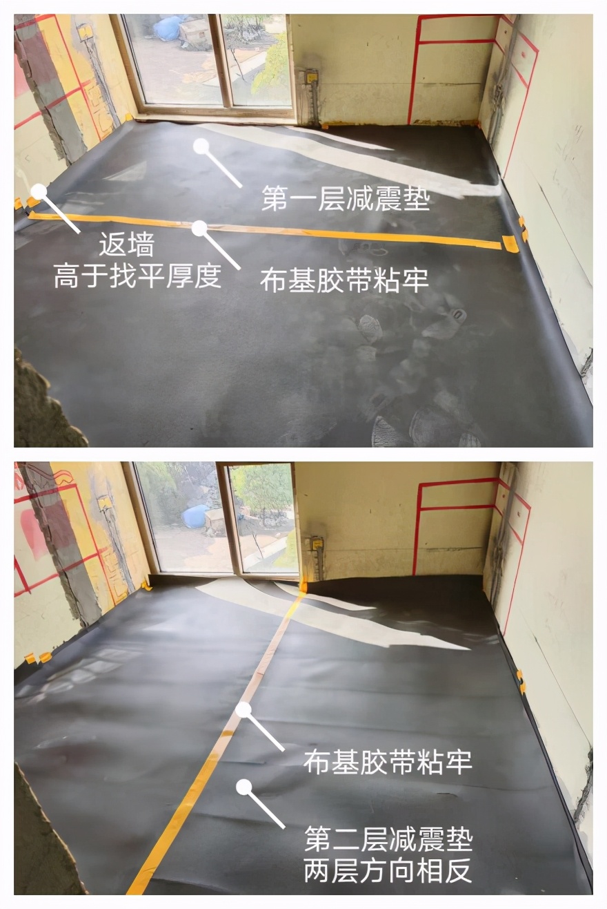 5. 减震垫铺装。两层需要错缝铺,避免缝对缝。