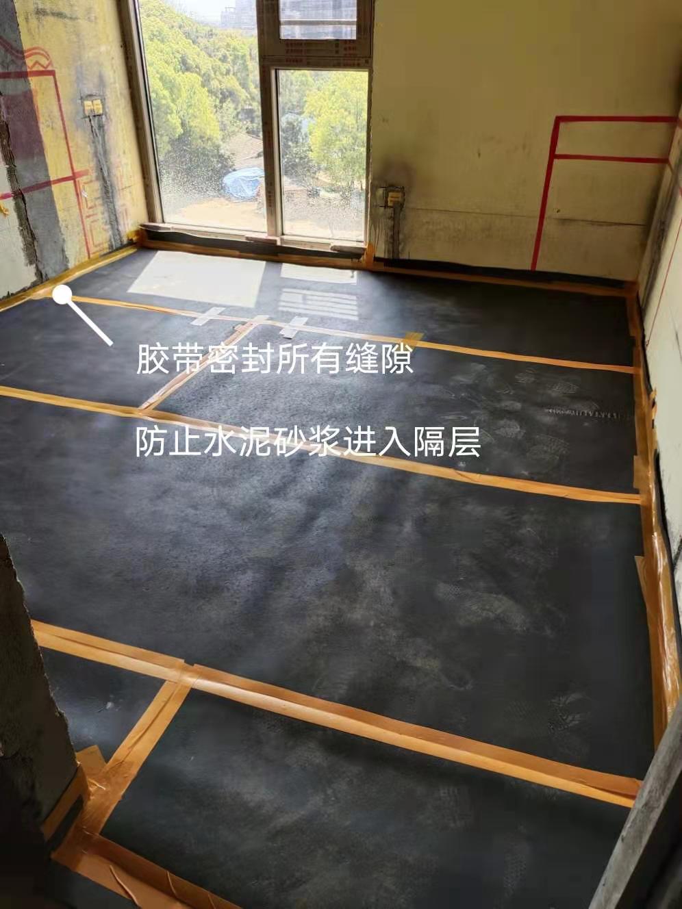 C20细石混凝土+5MM减震垫+5MM减震垫+3MM隔音毡+钢丝网+布基胶带。