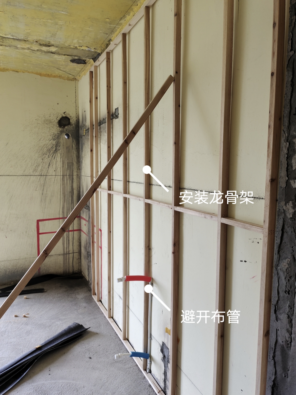3、装龙骨架,间距400mm以内,本方案选择3X4木龙骨,填充25mm厚度吸音棉刚刚好。