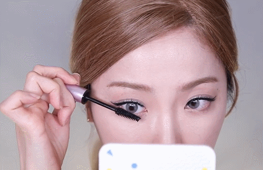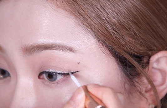 ↑整理出浓密的上、下睫毛后用白色提亮笔沿着下眼睑轻轻填满,增加眼睛的对比度。