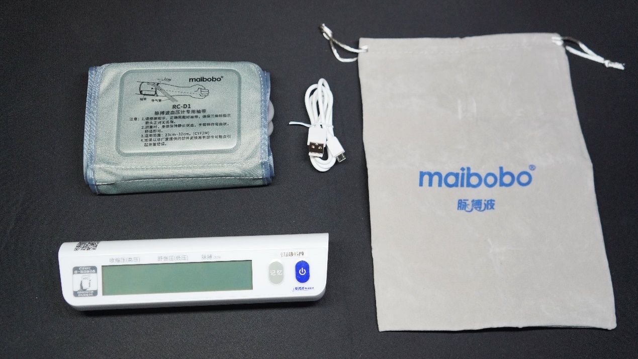 脉搏波血压计随包装提供了便携式主机一台,双管双传感袖带一个,Micro USB电源线一根,收纳袋一个。袖带与主机采用分离式设计,易于收纳。