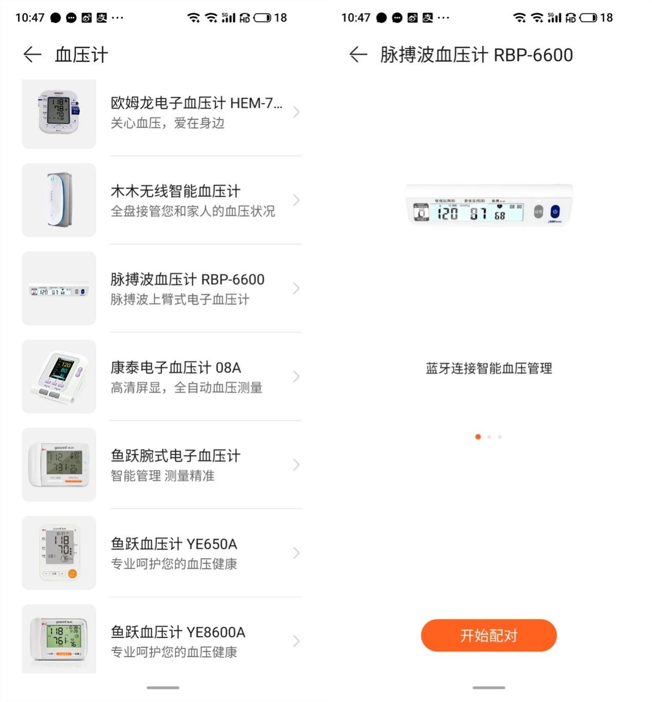 下面直接搭配华为智选脉搏波血压计进行体验。自带NFC功能的华为手机或荣耀手机用户,可以直接使用华为运动健康一碰联测量血压,让手机和血压计一碰互联,手机智慧识别场景并一步直达血压测量页面。非华为手机或荣耀手机用户需要先下载运动健康APP,在APP的设备页面下选择脉搏波血压计RBP-6600并按照操作提示绑定即可。