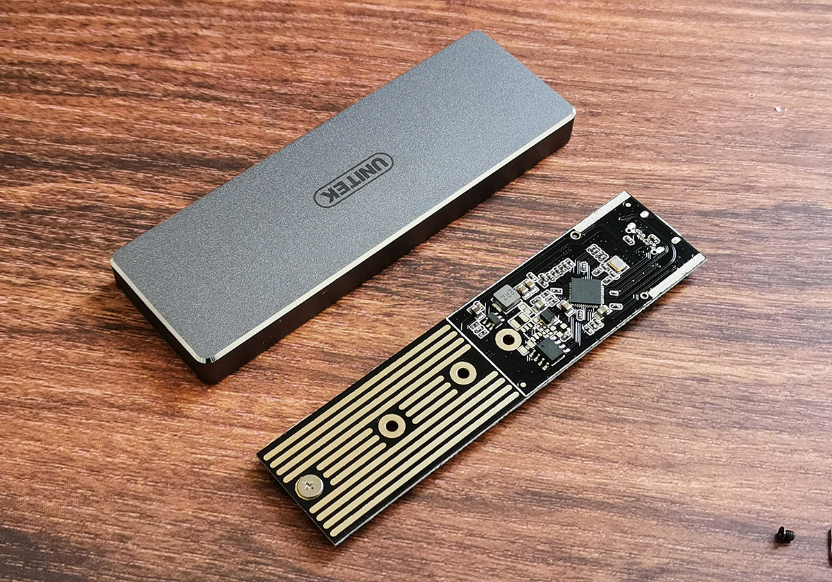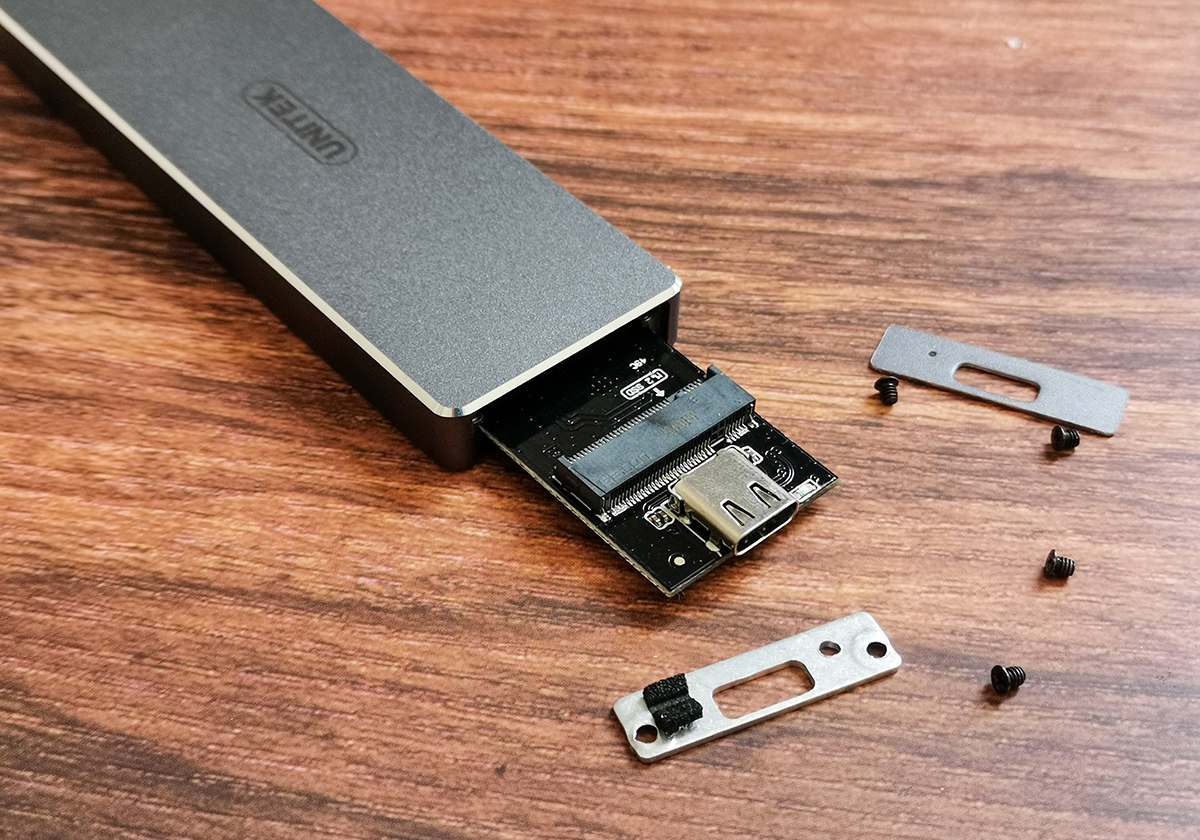 主板正面有四个螺丝孔,可以支持四种不同尺寸(30/42/60/80mm)的M.2固态硬盘,根据自己的硬盘尺寸安装即可。它采用的JMS576主控芯片+UASP加速协议+Trim指令,能够保持稳定的传输表现。