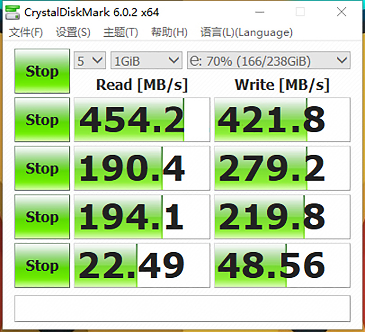 在优越者M.2硬盘盒上的读取速度为454MB/s,写入速度为421MB/s,其读取速度达到了SATA协议的标准,写入速度比主板上稍高了一点,都在正常范围之内,读取速度表现良好。