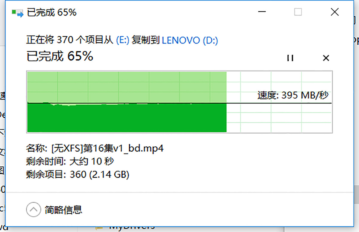 从硬盘盒中拷贝7.5GB的视频影音、文档等文件,平均速度基本稳定在395MB/秒,不到30秒就复制到电脑中,这个速度要比U盘快太多了,能够节省不少时间。