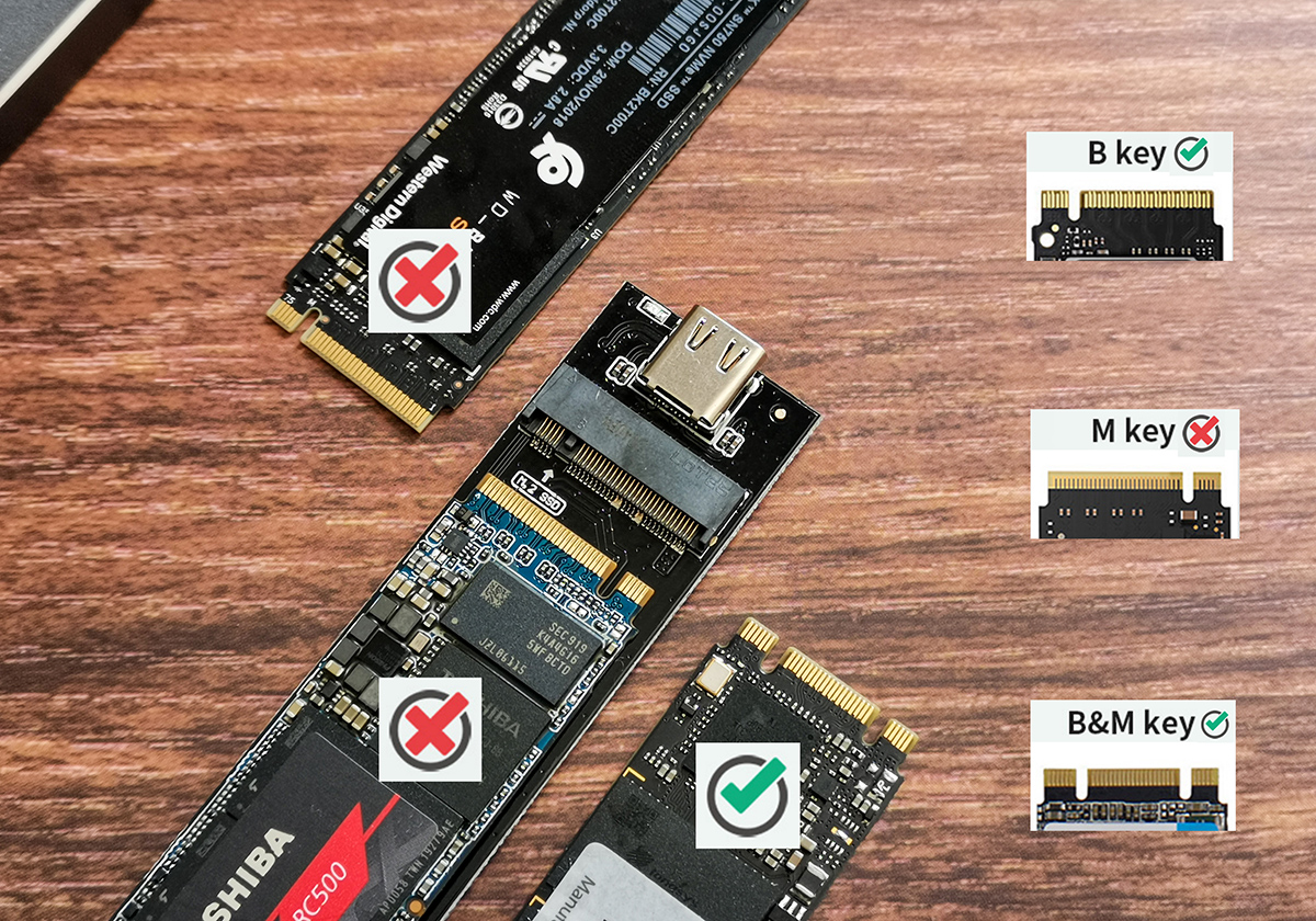 我这款优越者M.2硬盘盒采用的SATA协议,只支持B-Key(左边带缺口)和B&M-Key(左右各有一个缺口)接口的M.2固态硬盘安装。因为它不支持NVMe协议,所以M-Key(右边带缺口)接口的硬盘是不能安装的,大家需要注意一下。