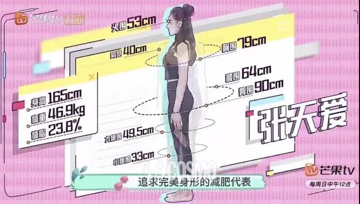 其次,张天爱不是干瘦的类型,不是骨瘦如柴的病态美,而是该瘦的地方瘦,该有肉的地方有肉,看着非常健康。从之前综艺里的数据可以知道,张天爱的腰臀比是0.7(腰臀比=腰围/臀围),而黄金腰臀比例是在0.67左右。