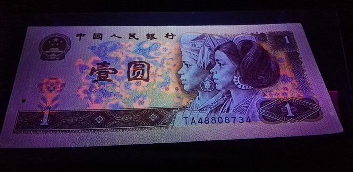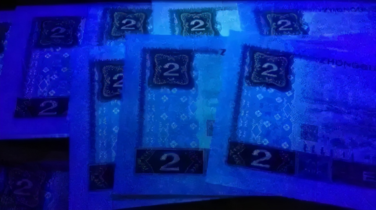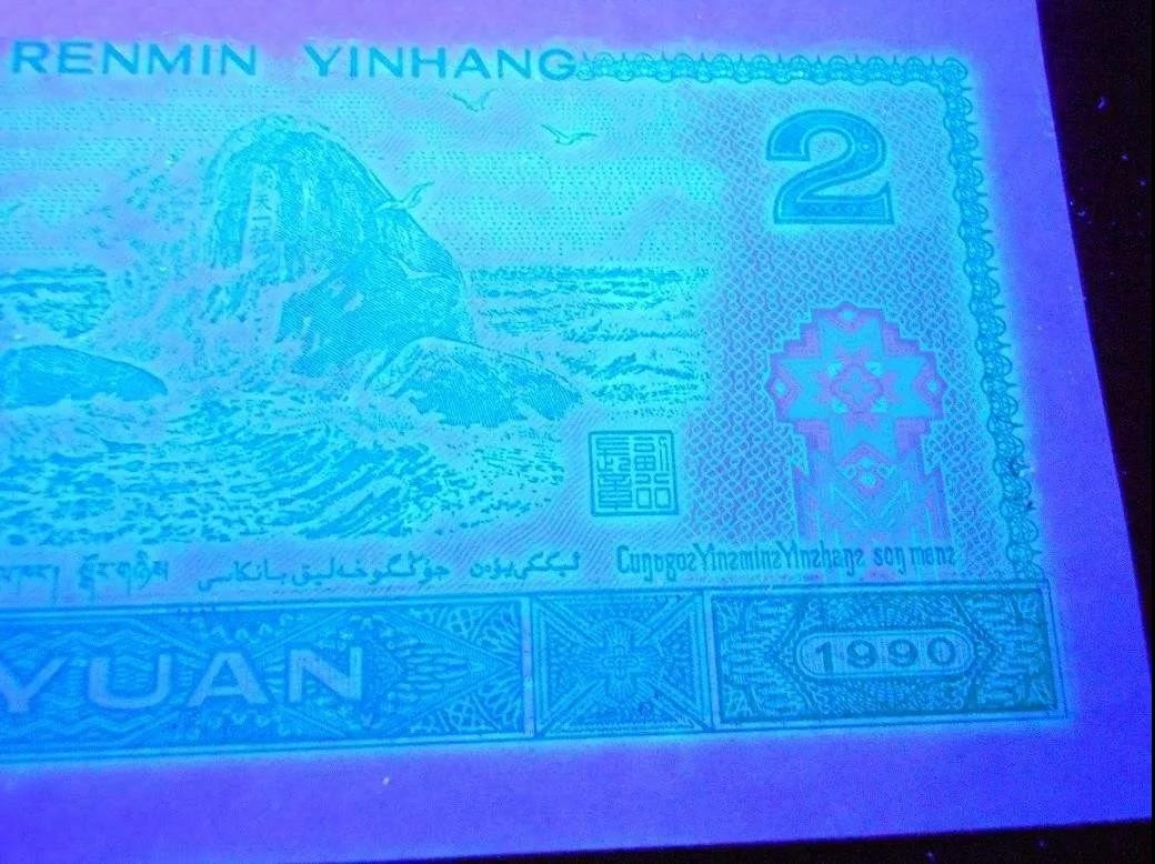 这几种颜色在壹角纸币上都进行了荧光试验。但大面积荧光油墨主要是两种:棕红色和黄色。细分大概是这样的:1、棕红色荧光油墨。主要是用在第一组的币上。此类荧光币还未得到充分开发。棕红色荧光也有浓淡之分,但没有黄荧光那么强烈。2、黄色荧光油墨。这种荧光油墨在壹角纸币上是大量的,主要用在币背面的国徽、两边花朵上以及有黄色的图案上。这种油墨又有浓淡之分。浓的是强荧光,淡的是中强荧光和弱荧光。3、其它颜色荧光油墨。主要是正面边框底纹和背面次要图案上。