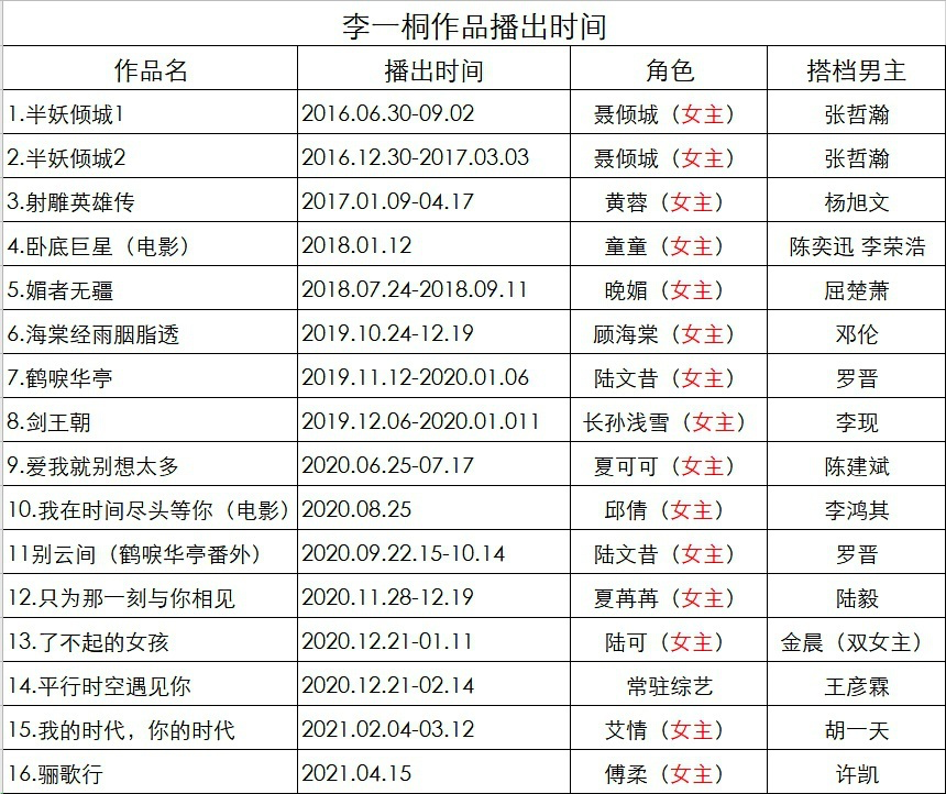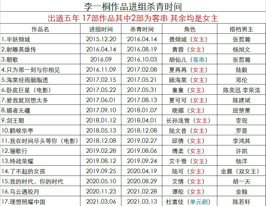还有网友整理了李一桐出道以来的行程表,发现她演的剧制作都挺大的,出道五年演了17部戏,其中2部是客串,其余都是女一号,景甜的电视剧女一只是她的零头!