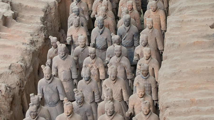 兵马俑,即秦始皇兵马俑,亦简称秦兵马俑或秦俑,第一批全国重点文物保护单位,第一批中国世界遗产,位于今陕西省西安市临潼区秦始皇陵以东1.5千米处的兵马俑坑内。 兵马俑是古代墓葬雕塑的一个类别。古代实行人殉,奴隶是奴隶主生前的附属品,奴隶主死后奴隶要作为殉葬品为奴隶主陪葬。兵马俑即制成兵马(战车、战马、士兵)形状的殉葬品 。