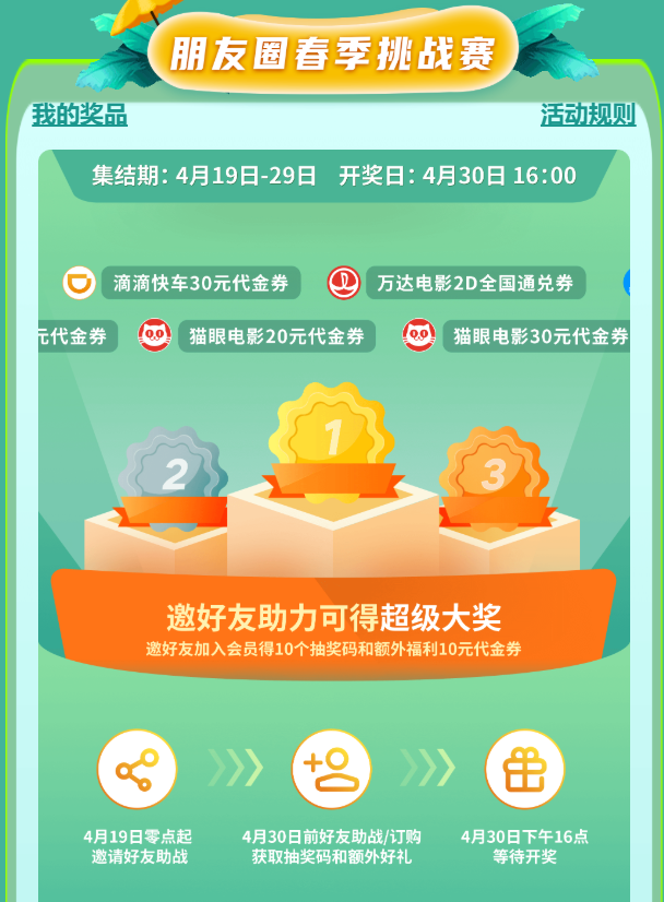对于喜欢看电影、经常打车的用户,在4.19~4.29期间还能参与此次“朋友圈春季挑战赛”的活动,邀请朋友订阅PLUS黄金会员,且好友下个月还是黄金会员,就可以获得抽奖码,还能领取滴滴打车和猫眼电影代金券,最多可以领取2000块。